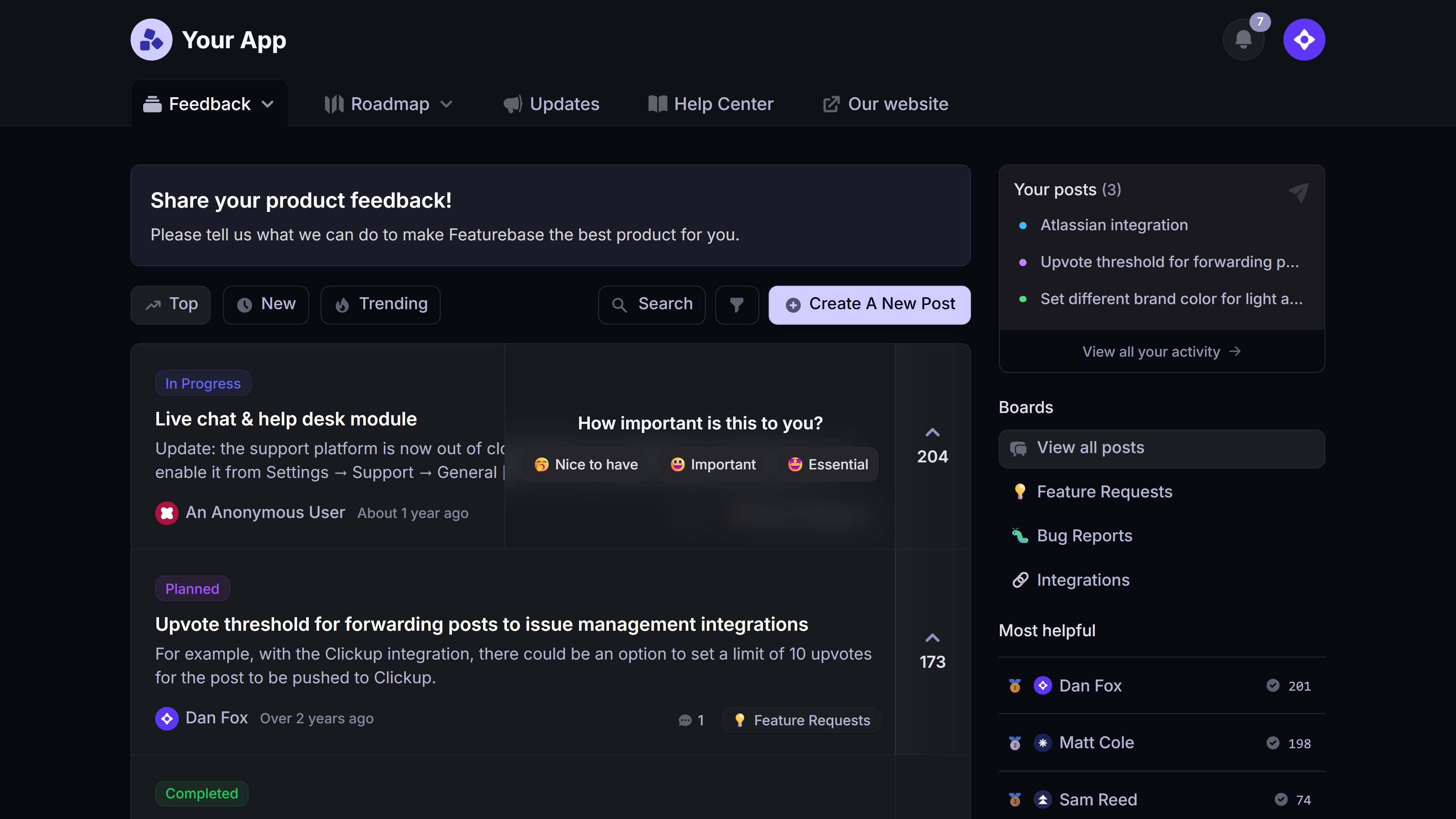 Featurebase is a modern feedback management platform with a clean interface and many integrations. However, like most feature request tools, it's designed for web applications and SaaS products, not native mobile apps.